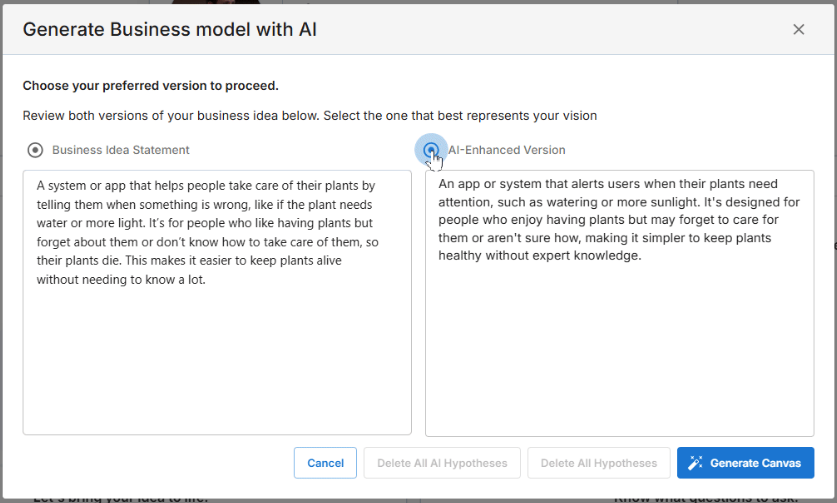 Locate the magic wand icon within each Canvas section to review the suggested hypotheses for them. Select the hypotheses you want to add to your Canvas then click "Accept" and/or select hypotheses that you don't want to include and click "Reject".