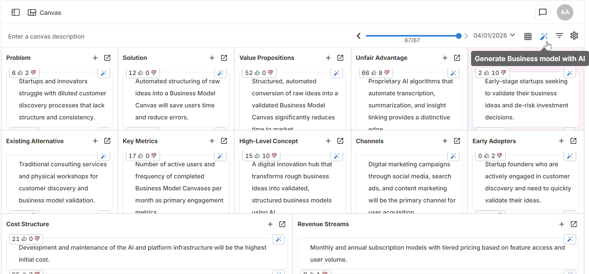 - Click the magic wand icon labeled “Generate Business Model with AI”