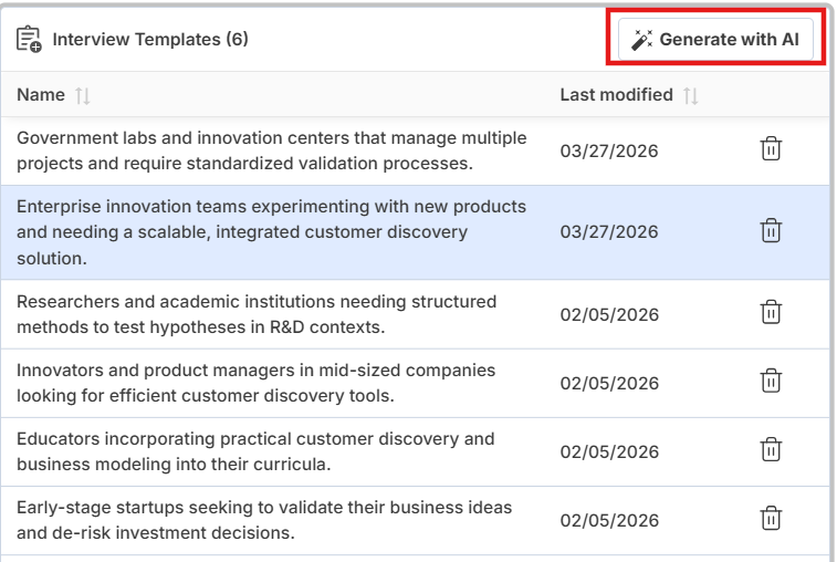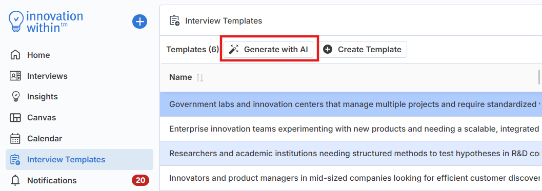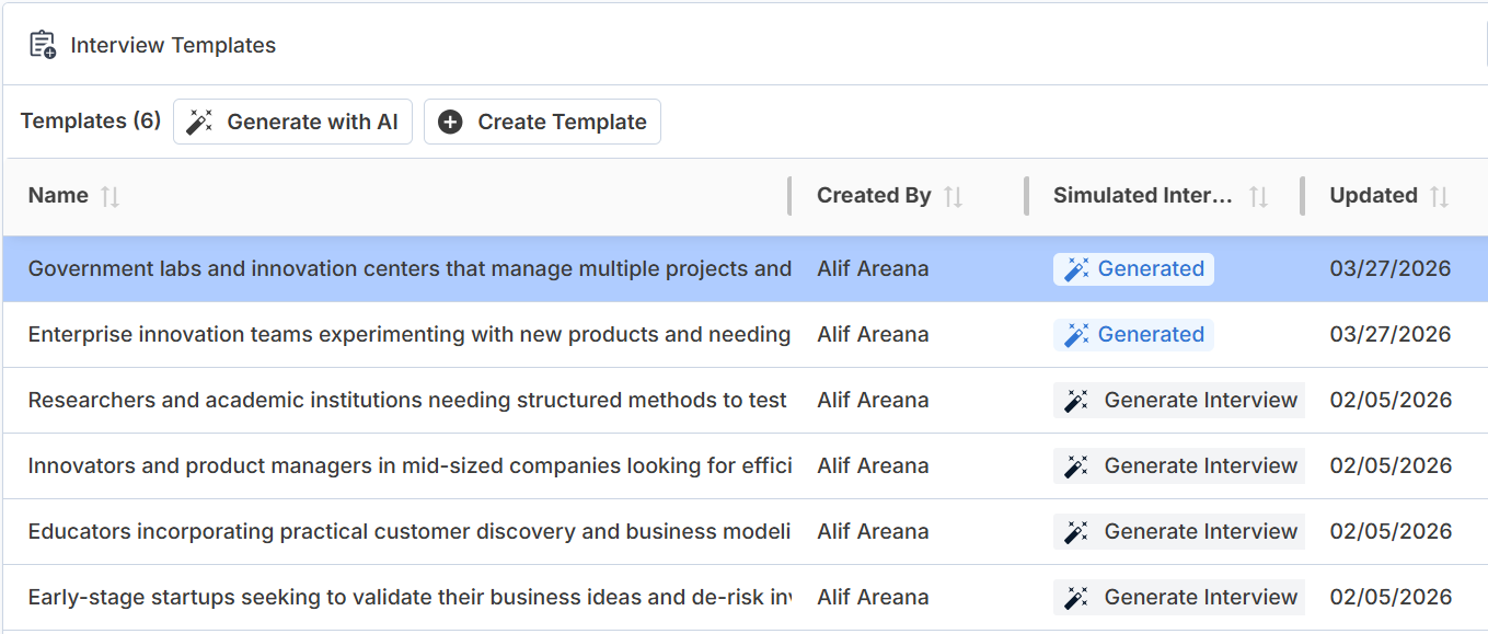 Turn your Customer Segments into practical interview templates. For each Customer Segment outlined in your Canvas, AI generates customized customer discovery questions. These questions help you validate your business model and kick start your interviews. Create or Access these templates from the Home page under the "Interview Templates" section or via the Interviews feature by clicking the “View Templates” button. Templates can be adjusted by team members as needed. To trigger the creation of interview templates you'll want to be on the Home page.