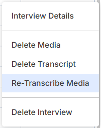 - Re-transcribing for Insights: For interviews with existing transcriptions, use the "Re-Transcribe Media" option from the interview menu. This refreshes the transcription and generates new AI Insights. Be aware that existing Insights may be updated or replaced if the transcription text has been modified.