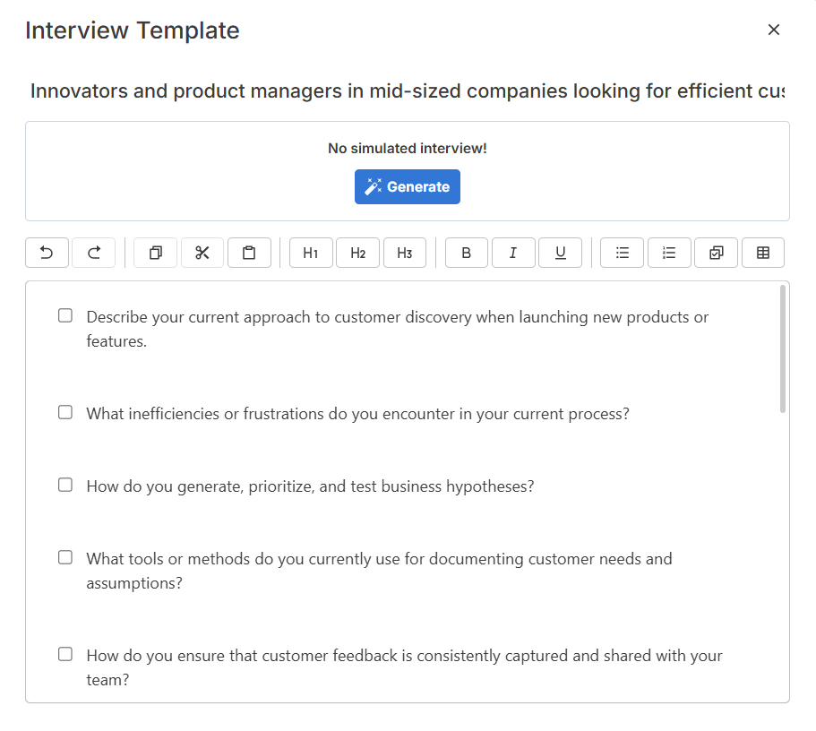 Simulated Interviews are a powerful way to accelerate early-stage discovery and sharpen your thinking before engaging with real customers.