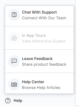In addition to chat channels, the Help menu (bottom-left corner) provides access to platform support and resources:
