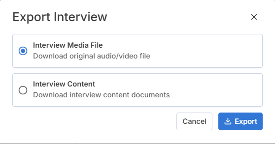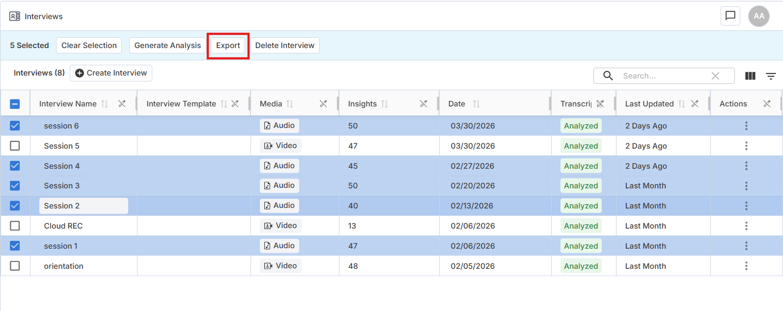 You can export up to 5 media files at a time. If more than 5 interviews are selected, the export media file option will be disabled. To proceed, reduce your selection to 5 or fewer interviews.