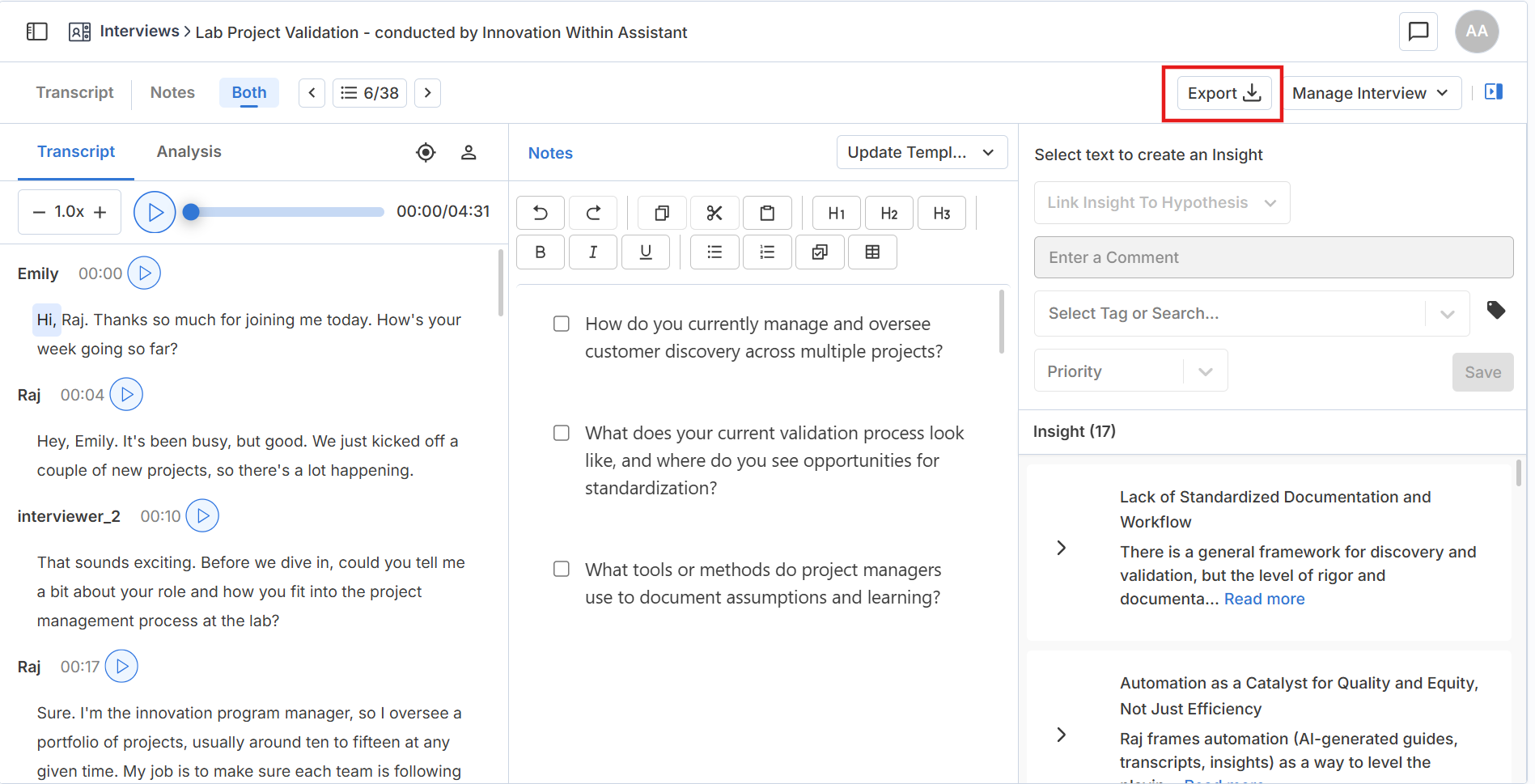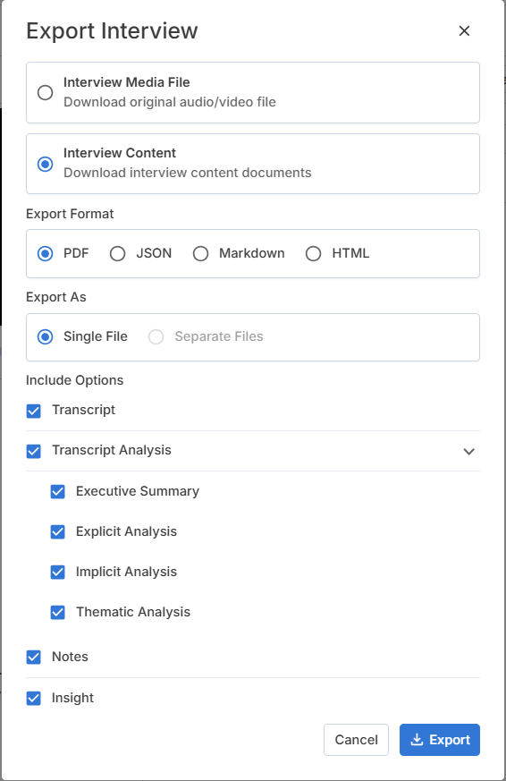 The Export feature is designed to help you move from capturing conversations to sharing and operationalizing insights. Throughout your customer discovery process, you generate valuable data — interviews, transcripts, notes, and structured insights. Export allows you to take that work outside the platform in a flexible, organized way, whether you’re preparing reports, collaborating with stakeholders, or conducting deeper analysis. Instead of manually compiling information, you can export exactly what you need — from raw recordings to fully structured, evidence-backed analysis — in formats that fit your workflow.