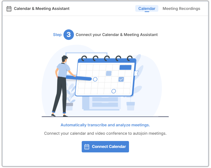 Calendar – Connect your calendar to schedule interviews, enable meeting recordings, and view upcoming and recorded meetings in one place.