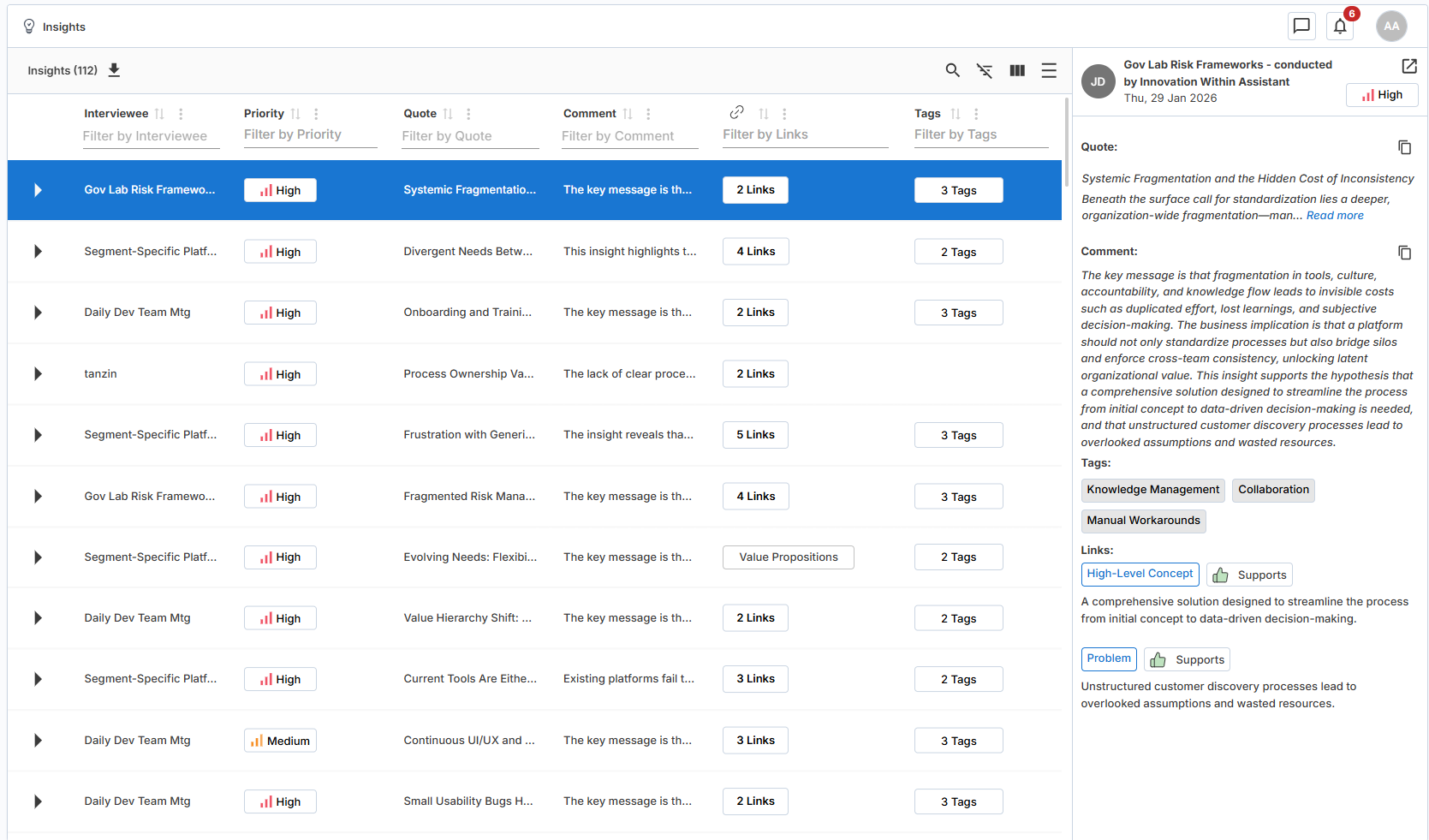 Rather than relying on a single interview, insights allow you to validate learning across multiple data points.