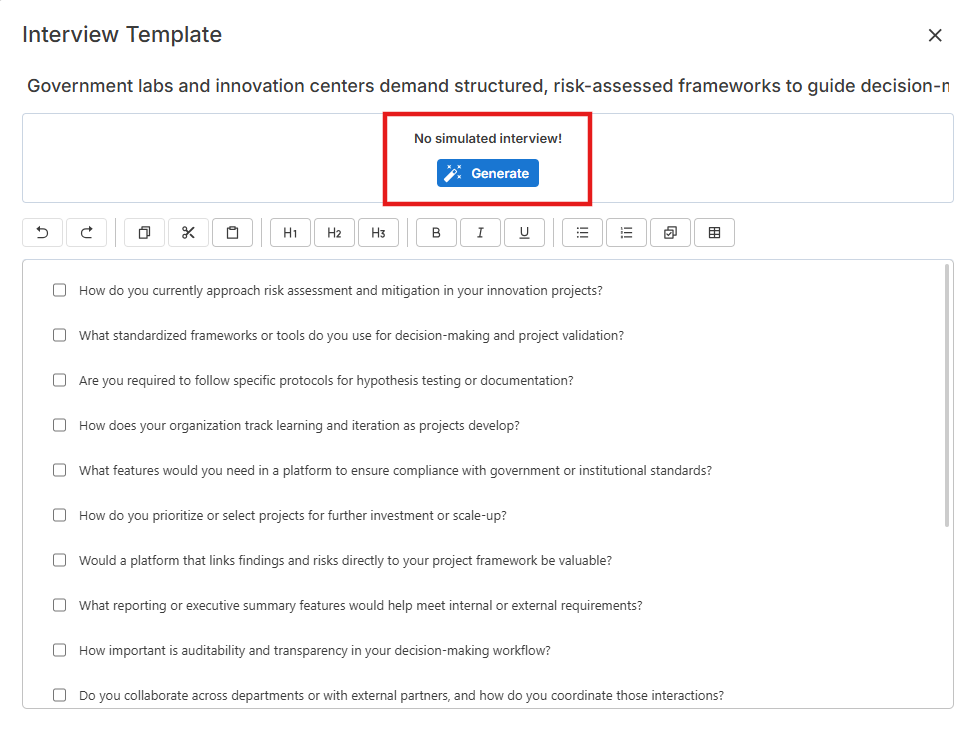 A Simulated Interview is generated directly from an Interview Template. The platform uses the questions in your template to run an AI-driven interview that mirrors a real customer discovery conversation.
